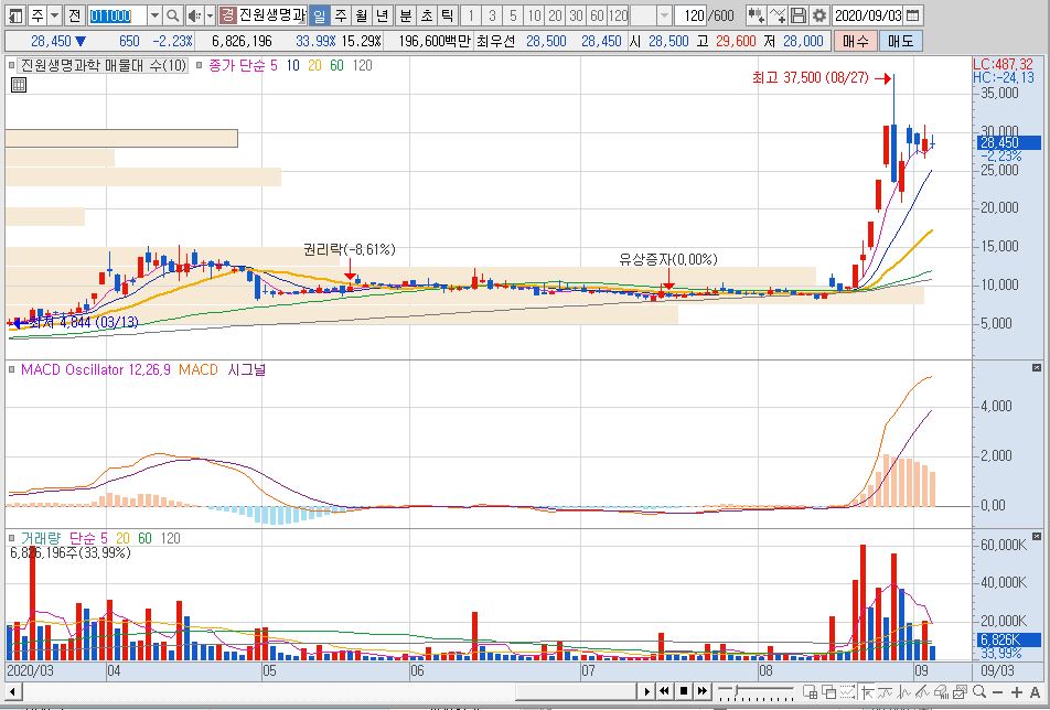 노바백스의 경우 초기 결과 투여량2 이후 참가자의 100%가 항체를 개발했으며 심각하는 부작용은 없는 것으로 나타났다는 기사에 초반 2자리수까지 상승했다가 상승폭을 반납하고 있습니다.