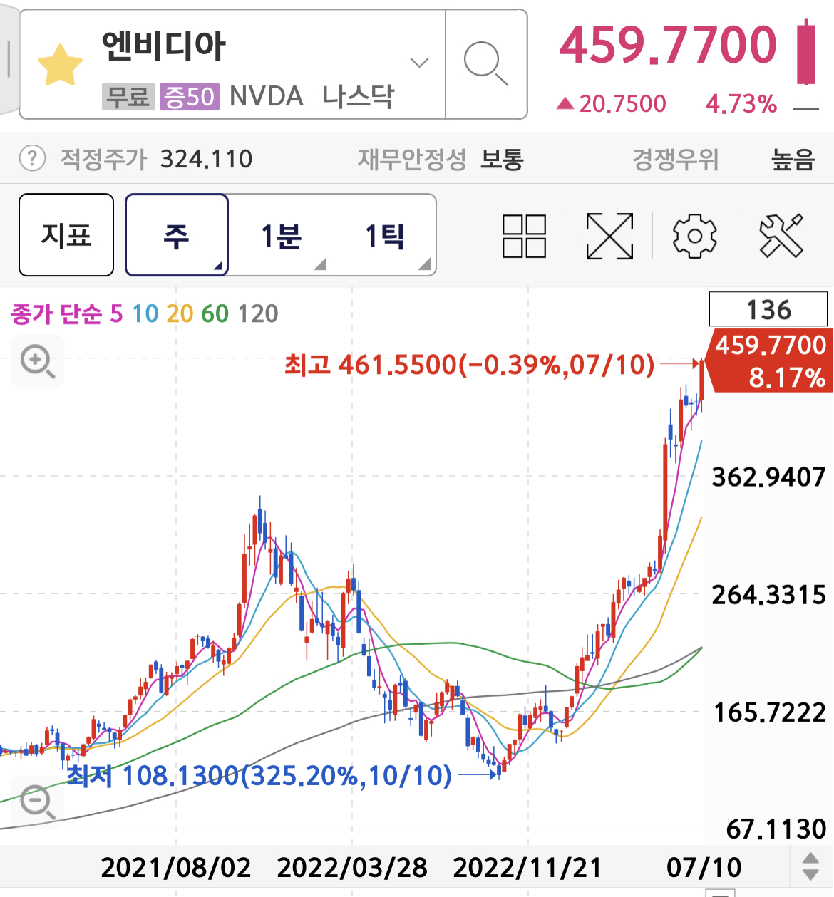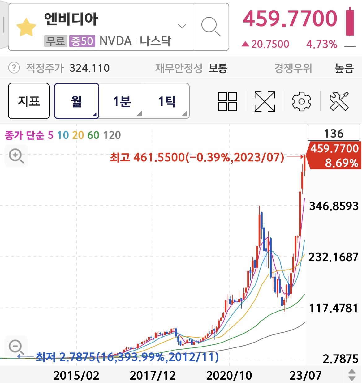 미국주식 장 마감 엔비디아의 주가는 459.77달러로 DoD +4.73%, 20.75달러 상승 마감했다.