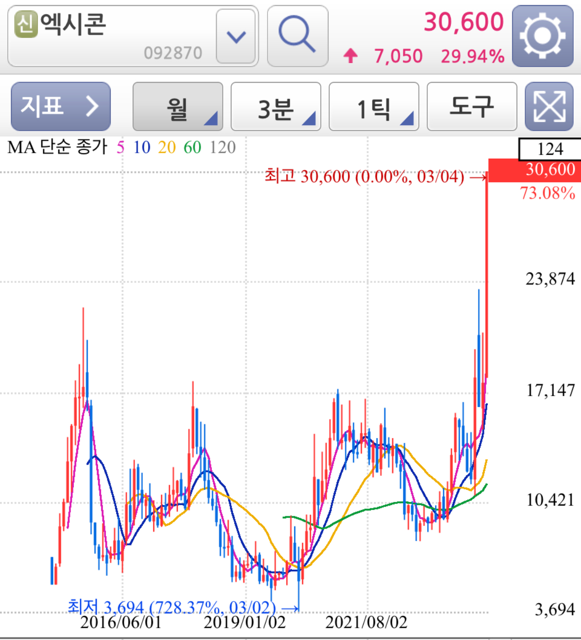 긴 장대양봉으로 CXL 관련 테마주중 3월은 엑시콘이 대장주로 장대 양봉으로 상한가 마감했습니다. 갭 상승으로 오르지 않고 장중 보합 수준에서 머무르다가 고점을 높이면서 결국 상한가 마감했습니다.