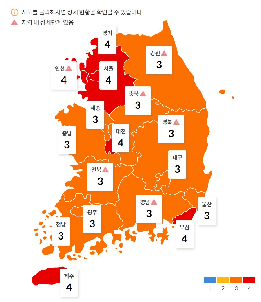 대전, 부산, 제주 3개 지역이 4단계입니다.