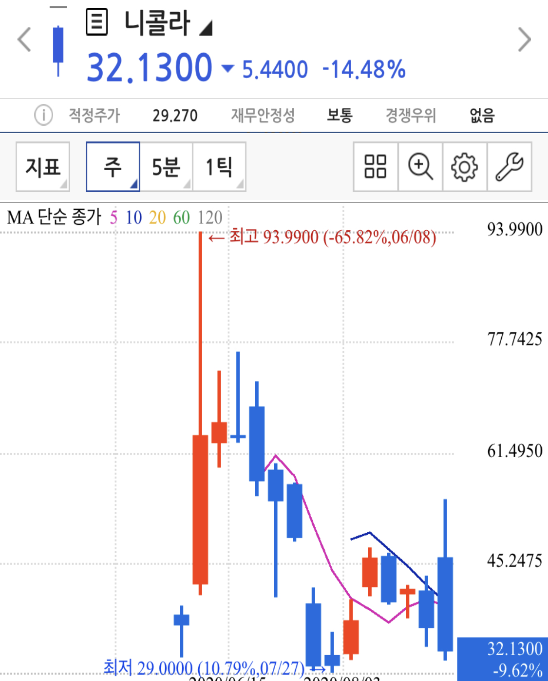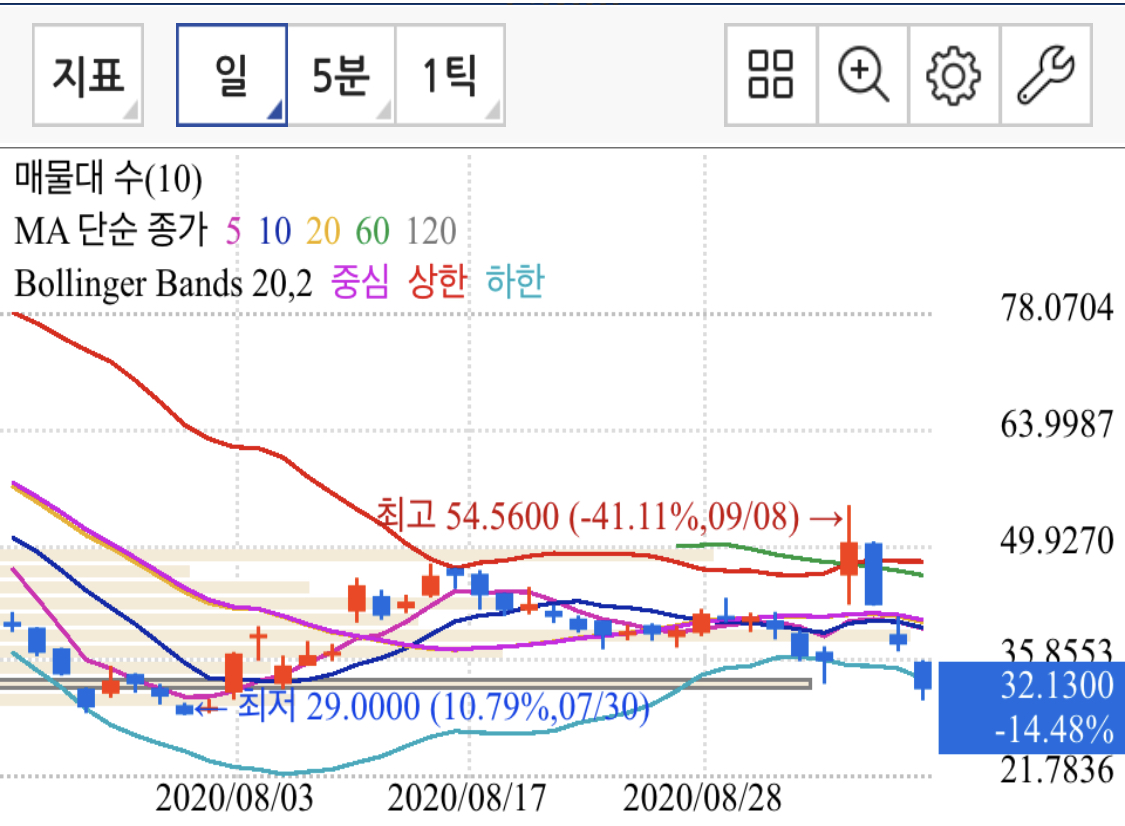 기간 조정없이 내리 큰 음봉을 보여주고 있어, 보유하지 않은 유저라면 상승 전환이나 뉴스를 접하고 매수해도 충분히 늦이 않나 싶습니다.