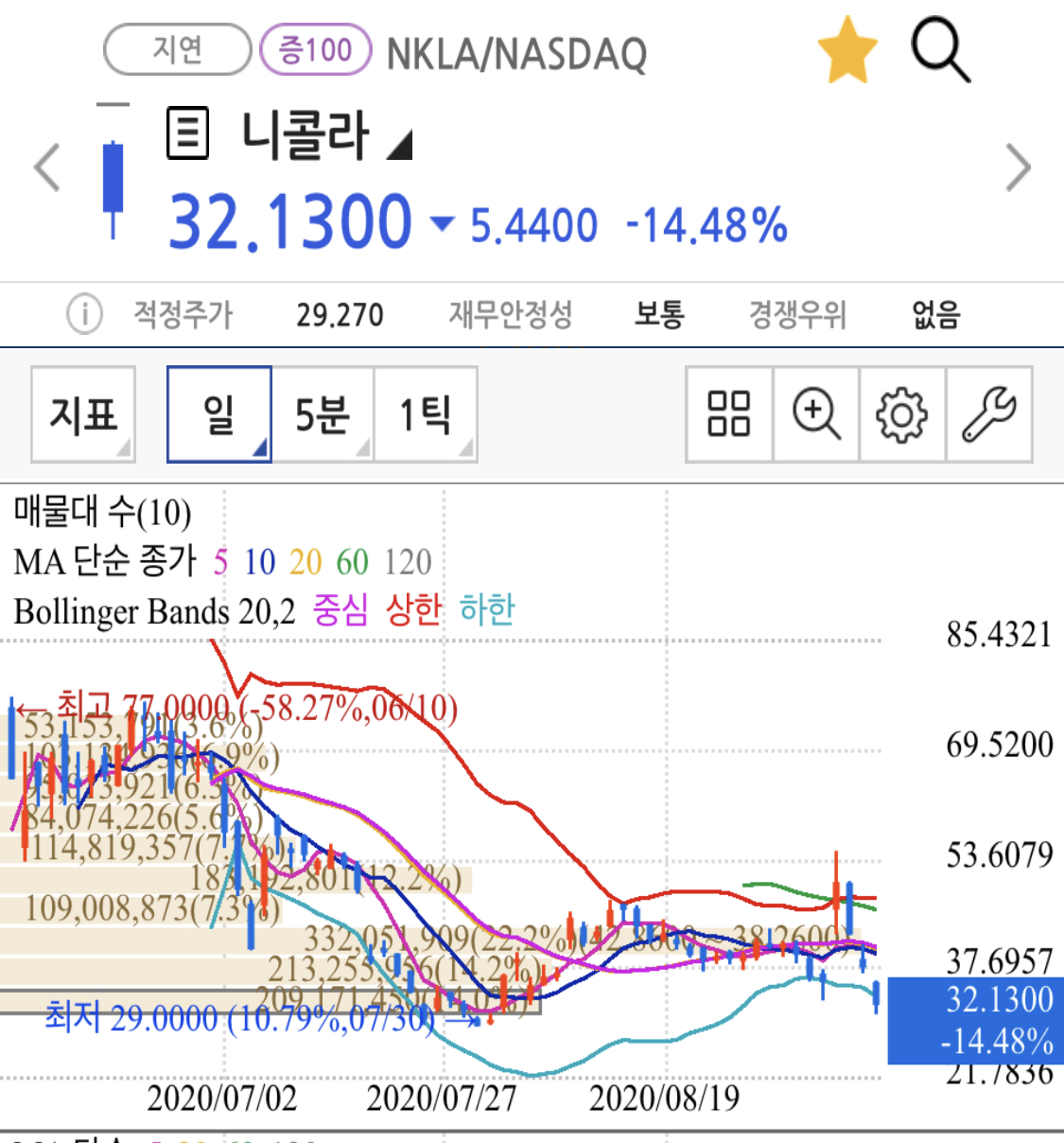 국내 해외주식 직접 투자자가 가장 많이 가지고 있는 10대 종목에 포함되는 니콜라 주식이 연일 폭락 중에 있습니다.
